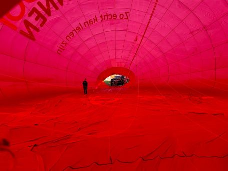 Nadat we met een heel team betrokkenen afgelopen week de verschillende delen van de ballon hebben verzameld vanuit Duitsland, België en Nederland, was het vandaag lekker rustig weer om de ballon te bekijken met koude lucht erin (cold-inflation). Hierna heb ik hem nog even verwarmd en daarmee kwam de ballon mooi overeind(hot-inflation). En wat ben ik blij met deze ballon!
